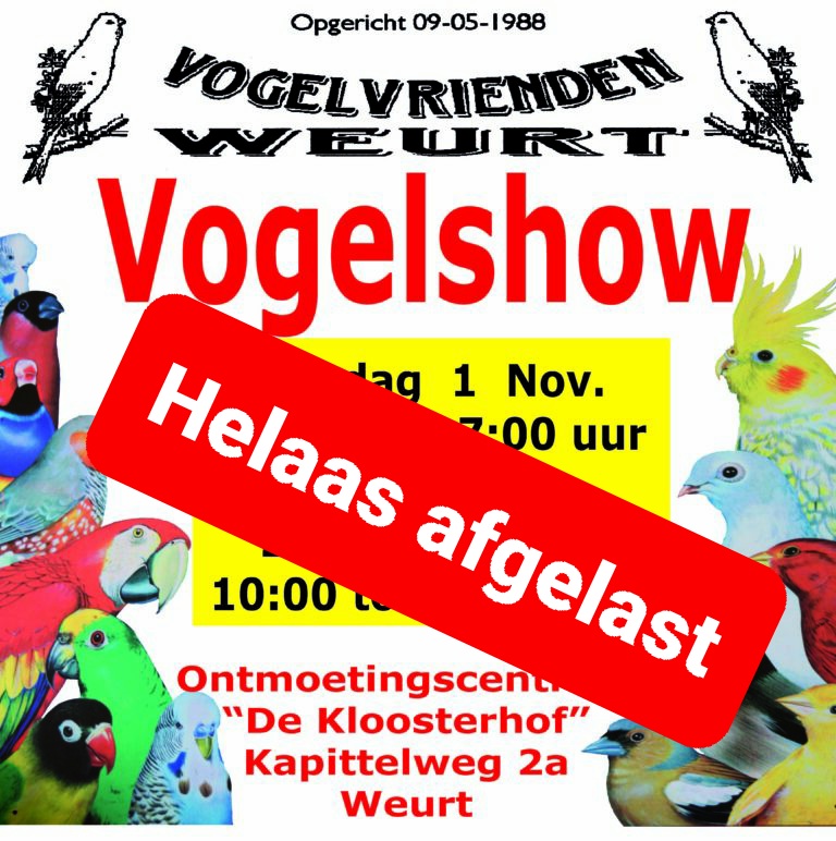 Helaas hebben wij moeten besluiten om de tentoonstelling van “Vogelvrienden Weurt” af te lassen. In Dodewaard is vogelgriep vastgesteld en is daarom een vervoersverbod in een straal van 10 kilometer rond het bedrijf ingevoerd, waarbinnen geen vogels mogen worden vervoerd.